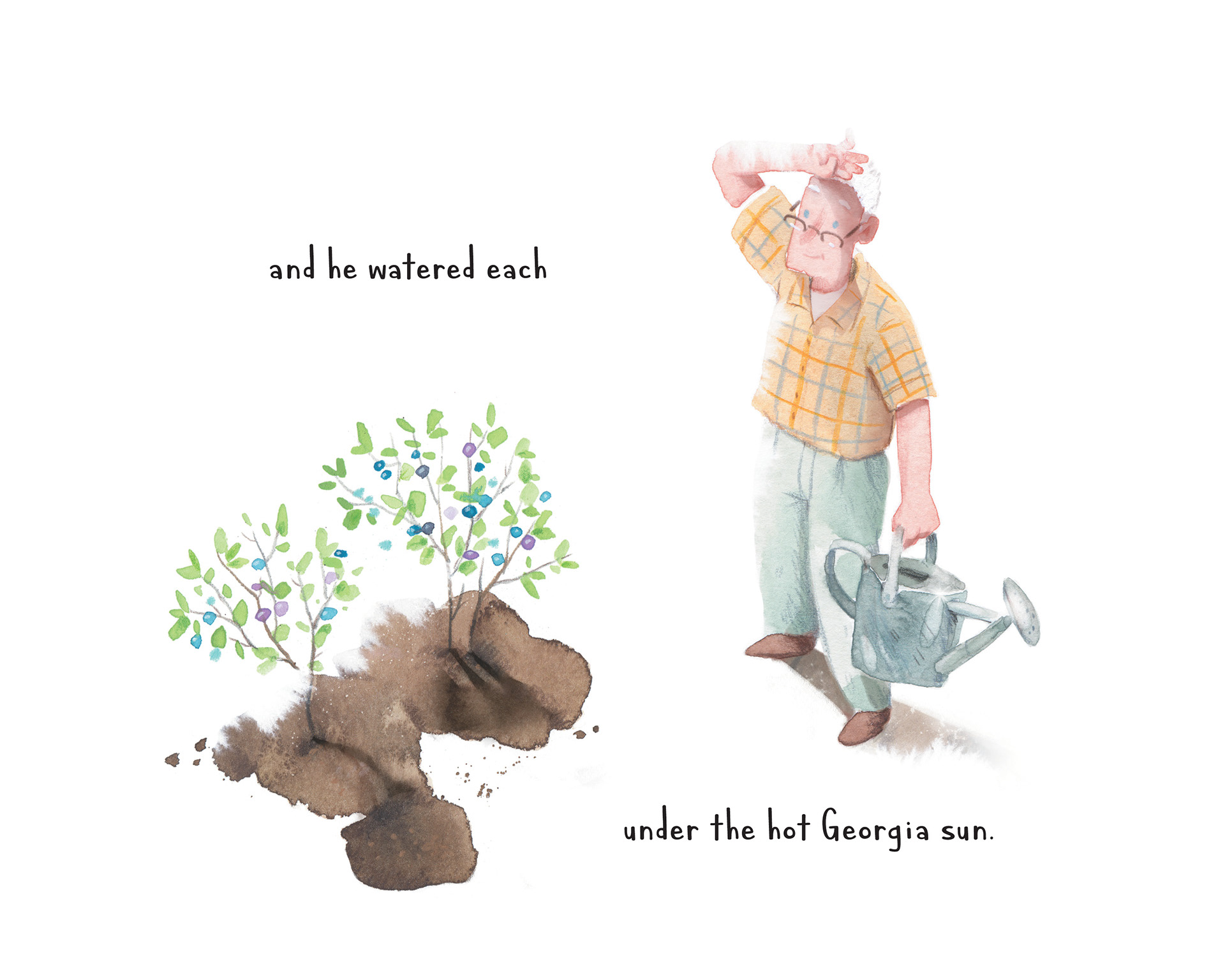 Written by Christina E. Petrides and Illustrated by Nika Tchaikovskaya. Published in 2020. This is a true story, a picture book based on the author's childhood memories in Georgia, USA. Christina remembers her grandfather, an American Navy veteran who had fought in the Second World War. After the war, he worked as a farmer, and grew many delicious blueberries, which he generously shared with friends and neighbors.